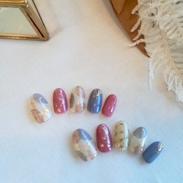 【ネイルチップ】成人式・和装におすすめ☆ピンクパープル&花柄<ショートサイズ>