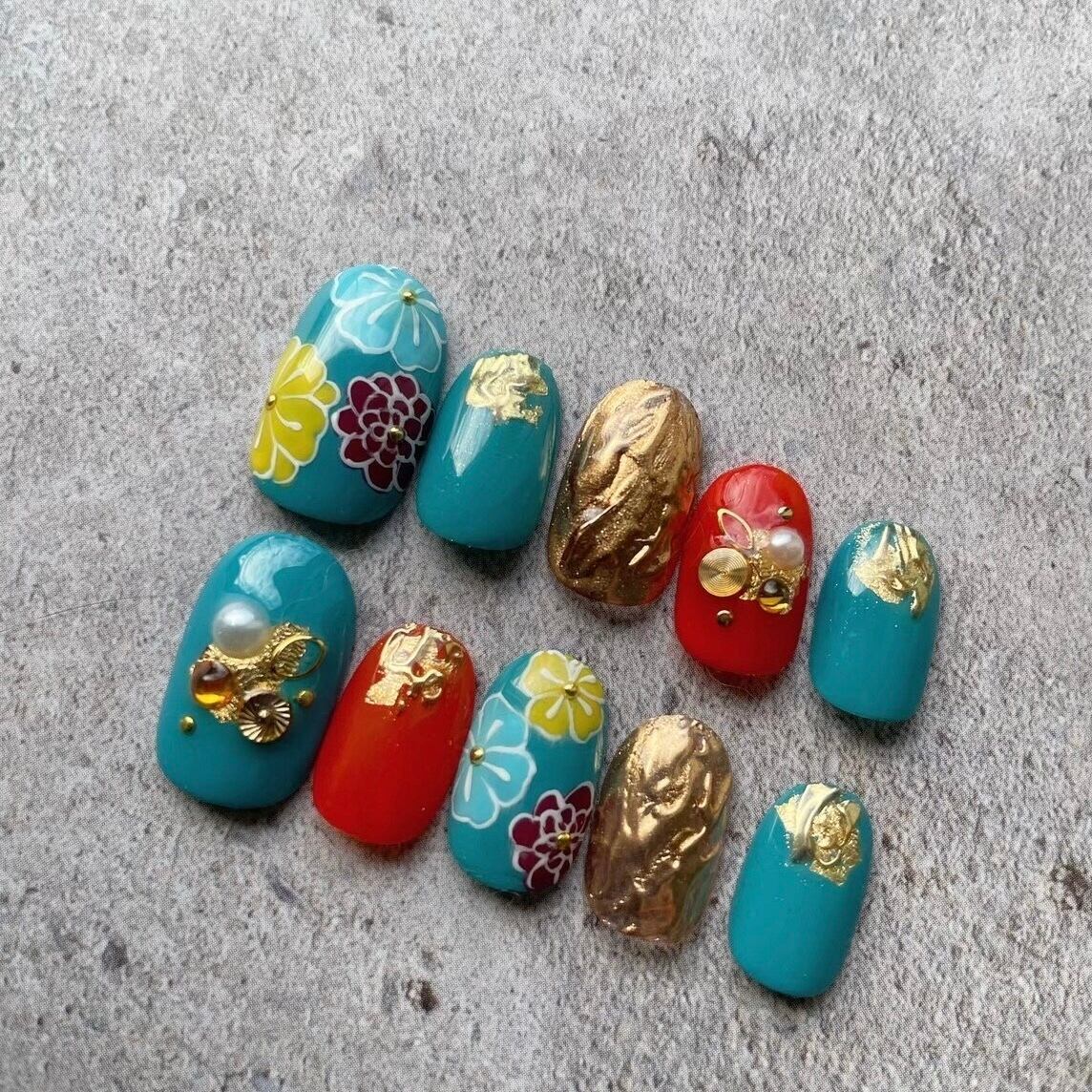 【ネイルチップ】成人式・和装におすすめ☆ターコイズ&お花・ミラー<ショートサイズ>